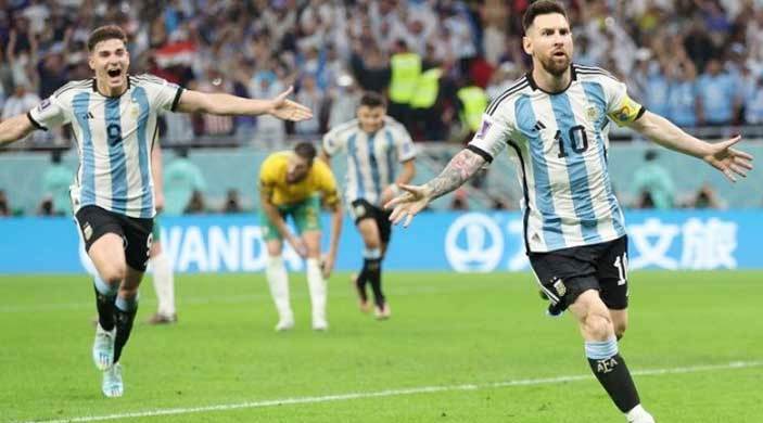 শনিবার দিবাগত রাতে লিওনেল মেসি ও জুলিয়ান আলভারেজের গোলে অস্ট্রেলিয়াকে ২-১ গোলে হারায় আলবেসিলেস্তরা।এর মাধ্যমে কোয়ার্টার ফাইনাল নিশ্চিত করল লিওনেল স্কালোনির শিষ্যরা। আহমেদ আলি স্টেডিয়ামে অস্ট্রেলিয়ার বিপক্ষে ম্যাচের শুরু থেকেই আধিপত্য ধরে রাখলেও বলার মতো আক্রমণ করতে পারছিল না আলবিসেলেস্তেরা।