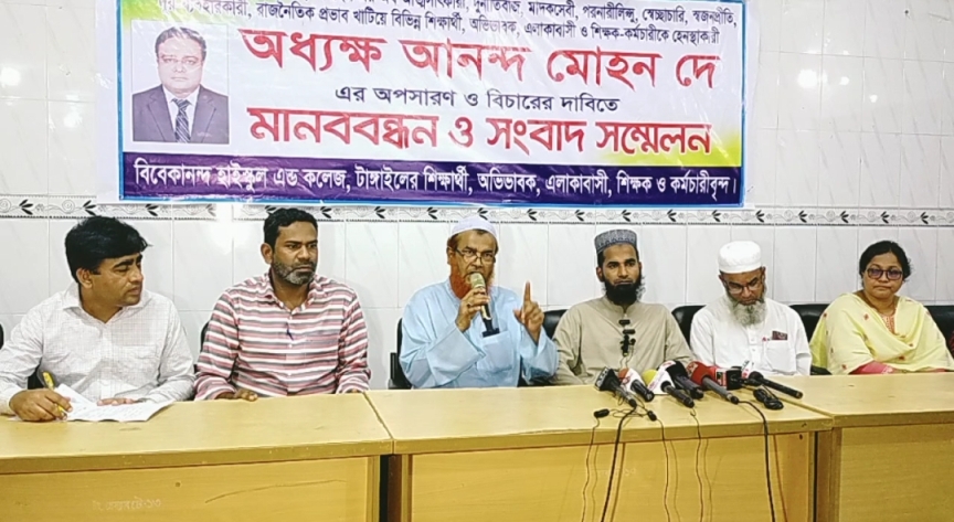 সাংবাদিক সম্মেলনে লিখিত বক্তব্যে জানানো হয়, ঐতিহ্যবাহী বিবেকানন্দ হাইস্কুল এন্ড কলেজ, প্রায় শতবর্ষী একটি শিক্ষা প্রতিষ্ঠান। শিক্ষা প্রতিষ্ঠানের গভর্নিং বডির সভাপতি হিসাবে টাঙ্গাইল জেলা আওয়ামী লীগের সাধারণ সম্পাদক জোয়াহেরুল ইসলাম (ভিপি জোয়াহের) ও তার স্ত্রী জনাব রওশন আরা খান দায়িত্ব পালন করে আসছেন। আওয়ামী পরিবার কেন্দ্রিক সভাপতির ছত্রছায়ায় অধ্যক্ষ আনন্দ মোহন দে শিক্ষা প্রতিষ্ঠানটিকে একটি রাজনৈতিক কার্যালয়ে পরিণত করেন। এমন কি অধ্যক্ষ আনন্দ মোহুন দে গভর্নিং বডির সভাপতি (ভিপি জোয়াহের) এর হাত ধরে টাঙ্গাইল জেলা আওয়ামীলীগের উপ- দপ্তর সম্পাদকের পদ লাভ করেন। এর পর হতে শিক্ষা প্রতিষ্ঠানটিকে অধ্যক্ষ আনন্দ মোহন দে রাজনৈতিক প্রতিষ্ঠান হিসেবে ব্যবহার করে আসছেন। রাজনৈতিক পদ পদবি ও ক্ষমতার অপব্যবহার করে অধ্যক্ষ আনন্দ মোহন দে প্রতিষ্ঠানের বিভিন্ন দুর্নীতি, স্বজন-প্রীতি, অনিয়ম, স্বেচ্ছাচারিতা, দুর্ব্যবহার, রাজনৈতিক প্রভাব খাটিয়ে অর্থ তছরুপ ও প্রতিষ্ঠানের শিক্ষক-শিক্ষিকা, কর্মচারী, অভিভাবক ও শিক্ষার্থীদের শারীরিক ও মানসিক ভাবে নির্যাতন করে আসছেন।