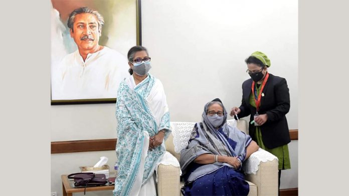 প্রধানমন্ত্রীর প্রেস সচিব ইহসানুল করিম গণমাধ্যমকে এ তথ্য জানিয়েছেন। তিনি বলেন, মাননীয় প্রধানমন্ত্রী আজ (বৃহস্পতিবার) বিকালেই টিকা নিয়েছেন। এ সময় প্রধানমন্ত্রীর পাশে ছিলেন তার ছোটবোন শেখ রেহানা। এর আগে গত ২৪ ফেব্রুয়ারি করোনার টিকা নেন শেখ রেহানা। গত বছরের ডিসেম্বরে চীনে করোনাভাইরাসের উপদ্রব শুরু হয়। এটি বর্তমানে বিশ্বের ২১৩ দেশ ও অঞ্চলে ছড়িয়ে পড়েছে। ১১ মার্চ করোনাকে বৈশ্বিক মহামারি ঘোষণা করে বিশ্ব স্বাস্থ্য সংস্থা। বাংলাদেশে করোনাভাইরাসের প্রথম সংক্রমণ ধরা পড়েছিল গত ৮ মার্চ। এর ১০ দিনের মাথায় ১৮ মার্চ প্রথম মৃত্যুর খবর আসে।