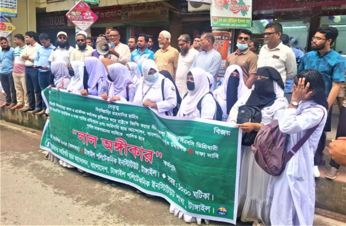 বিএসসি ডিগ্রিধারীদের অযৌক্তিক ৩ দফা দাবির প্রতিবাদ এবং কারিগরি ছাত্র আন্দোলনের ৬ দফা দাবি বাস্তবায়নের দাবিতে টাঙ্গাইলে বিক্ষোভ মিছিল ও লাল অঙ্গীকার কর্মসূচি পালিত হয়েছে। মঙ্গলবার (১৬ সেপ্টেম্বর) দুপুরে টাঙ্গাইল প্রেসক্লাবের সামনে এই কর্মসূচির আয়োজন করে টাঙ্গাইল পলিটেকনিক ইনস্টিটিউট ও কারিগরি ছাত্র আন্দোলন।