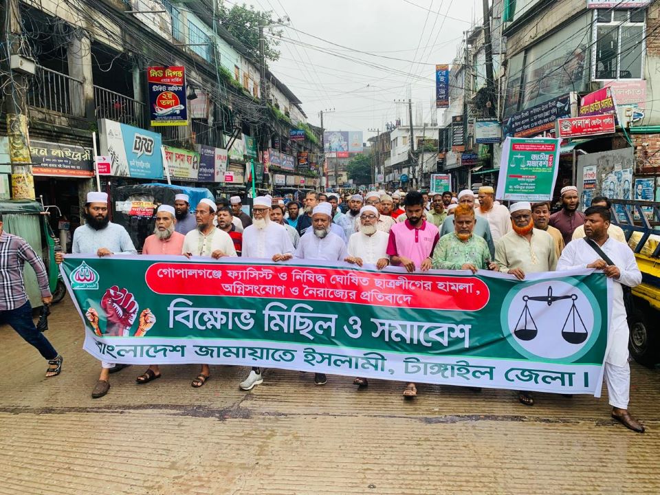 গোপালগঞ্জে ছাত্রলীগের সন্ত্রাসী হামলার প্রতিবাদে টাঙ্গাইলে বিক্ষোভ মিছিল ও সমাবেশ করেছে জেলা জামায়াতে ইসলামী। বৃহস্পতিবার (১৭ জুলাই) বিকেলে শহরের পুরাতন কোর্ট মসজিদের সামনে থেকে মিছিল শুরু হয়ে নিরালা মোড়, শহীদ মিনার, ভিক্টোরিয়া রোড ঘুরে পুরাতন বাসস্ট্যান্ডে সমাবেশের মাধ্যমে শেষ হয়।