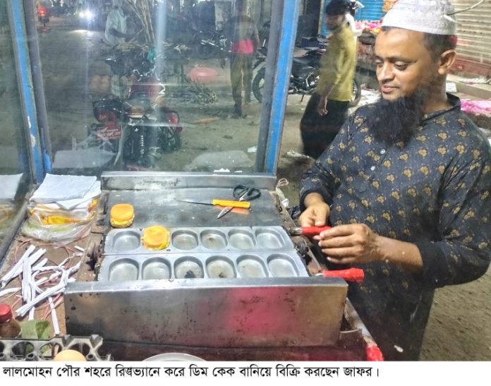 চার বছর ধরে ভোলার লালমোহন পৌর শহরে একটি রিক্সাভ্যানে করে ঘুরে ঘুরে ডিম কেক বানিয়ে বিক্রি করছেন মো. জাফর। প্রতিদিন এক থেকে দেড়শত ডিম কেক বিক্রি করতে পারেন তিনি।