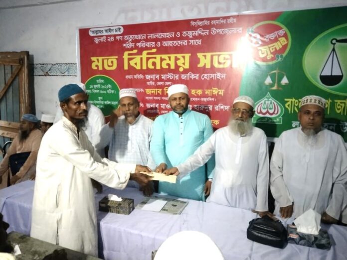 মতবিনিময় সভা শেষে লালমোহন ও তজুমদ্দিন উপজেলায় নিহত ১২ জন শহীদ পরিবারের মধ্যে নগদ দশ হাজার টাকা করে এবং আহত ৪৩ জনকে অর্থিক অনুদান প্রদান করা হয়। উল্লেখ্য এর আগে জামায়াতের পক্ষ থেকে জুলাই বিপ্লবে নিহত প্রত্যেক পরিবারকে নগদ ২ লক্ষ টাকা করে অনুদান প্রদান করা হয়েছে। সভায় জুলাই বিপ্লবে নিহত শহীদ পরিবারের সদস্য, আহতরা ও জামায়াতে ইসলামীর বিভিন্ন পর্যায়ের নেতাকর্মীগণ উপস্থিত ছিলেন।