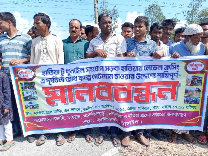 টাঙ্গাইলের কালিহাতীতে অরক্ষিত রেলক্রসিং এ রেলগেট স্থাপন ও গেটম্যানের দাবিতে মানববন্ধন অনুষ্ঠিত হয়েছে। শনিবার (৮ অক্টোবর) দুপুরে উপজেলার সল্লা ইউনিয়নের হাতিয়া-ধুনাইল সংযোগ সড়কের হাতিয়া রেলক্রসিং এলাকায় পাঁচ গ্রামবাসী সম্মিলিতভাবে এই মানববন্ধনের আয়োজন করে।