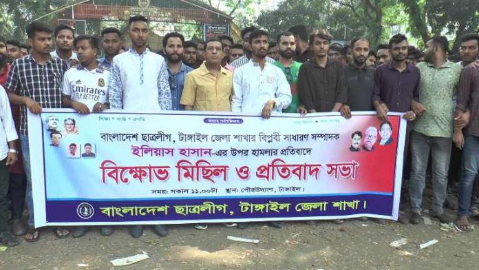 টাঙ্গাইল জেলা ছাত্রলীগের সাধারণ সম্পাদক ইলিয়াস হাসানের উপর হামলার ঘটনা ঘটেছে। এর প্রতিবাদে মঙ্গলবার ইলিয়াস হাসানের নেতৃত্বে জেলা ছাত্রলীগের একাংশ শহরে বিক্ষোভ মিছিল ও প্রতিবাদ সমাবেশ অনুষ্ঠিত হয়েছে।