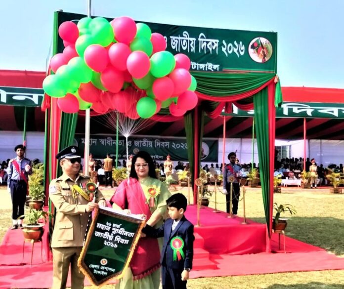 টাঙ্গাইলে বিপুল উৎসাহ-উদ্দীপনার মধ্য দিয়ে মহান স্বাধীনতা ও জাতীয় দিবস উদযাপিত হয়েছে। বৃহস্পতিবার(২৬ মার্চ) সূর্যোদয়ের সঙ্গে সঙ্গে ৩১ বার তোপধ্বনি ও জাতীয় পতাকা উত্তোলনের মাধ্যমে দিবসের কর্মসূচির সূচনা করা হয়।