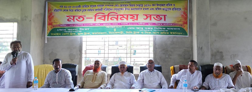টাঙ্গাইল জেলা ট্রাক-মিনি ট্রাক ও কাভার্ডভ্যান শ্রমিক ইউনিয়নের মত বিনিময় সভা অনুষ্ঠিত হয়েছে। সম্প্রতি সংগঠনের সাবেক সাধারণ সম্পাদক সোবাহান মিয়া বহিরাগতদের নিয়ে বর্তমান সভাপতি- সাধারণ সম্পাদকসহ কার্যাকরী পরিষদের সদস্যদের উপর হামলা ও অফিস ভাঙচুরের প্রতিবাদে বুধবার (১৩ সেপ্টেম্বর) দুপুরে শহরের নগরজালফৈ নিজস্ব কার্যালয়ে এ জরুরী মত বিনিময় সভার আয়োজন করা হয়।