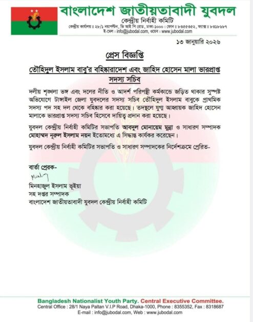 মঙ্গলবার (১৩ জানুয়ারি) যুবদলের কেন্দ্রীয় নির্বাহী কমিটির সহদপ্তর সম্পাদক মিনহাজুল ইসলাম ভূইয়ার স্বাক্ষরিত এক বিজ্ঞপ্তিতে এ তথ্য নিশ্চিত করা হয়।