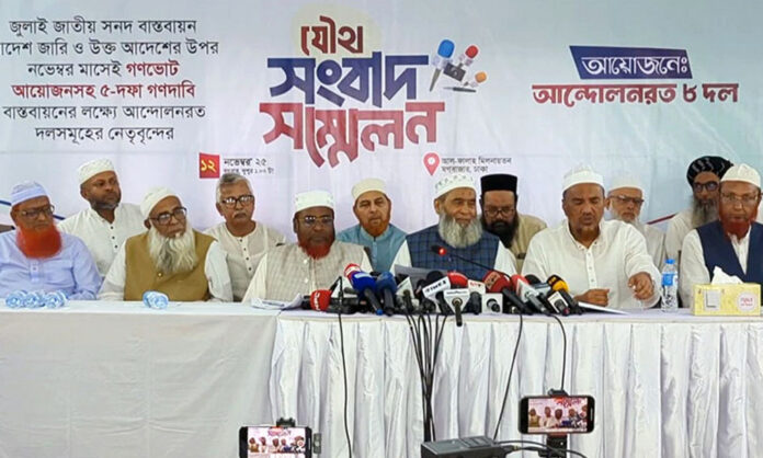 বাংলাদেশ জামায়াতে ইসলামীসহ আটটি রাজনৈতিক দল আগামী জাতীয় নির্বাচনের আগে পাঁচ দফা দাবিতে নতুন কর্মসূচি ঘোষণা করেছে। দাবি না মানলে প্রধান উপদেষ্টার কার্যালয় যমুনার সামনে অনির্দিষ্টকালের জন্য অবস্থান কর্মসূচি ঘোষণা করা হবে বলে হুঁশিয়ারি দেওয়া হয়।