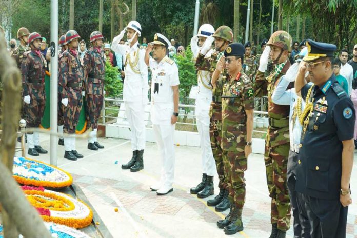 এ সময় পুস্পস্তবক অর্পণ শেষে শহীদদের প্রতি সম্মান প্রদর্শনে এক মিনিট নিরবতা পালন করা হয় এবং কর্মরত সামরিক সদস্যরা স্যালুট প্রদান করেন। পরে শহীদদের আত্মার মাগফিরাত কামনা করে দোয়া করা হয়। এ সময় সেনা, নৌ ও বিমান বাহিনীর ঊর্ধ্বতন সামরিক কর্মকর্তা, জেসিও এবং অন্যান্য পদবির সেনাসদস্য, শহীদ পরিবারের সদস্য ও নিকটাত্মীয় এবং গণমাধ্যম ব্যক্তিরা উপস্থিত ছিলেন।