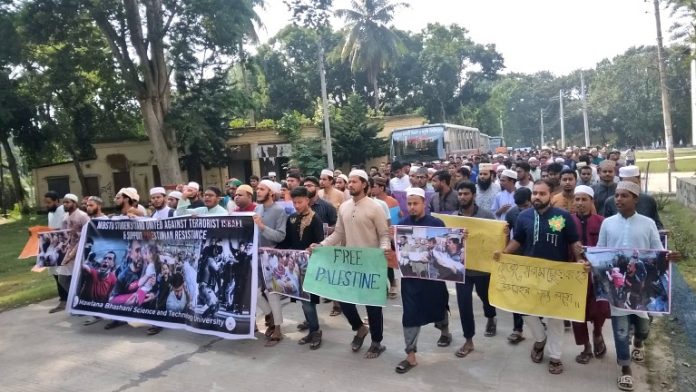 ফিলিস্তিনদের উপর ইসরাইলের সন্ত্রাসী হামলার প্রতিবাদে টাঙ্গাইলের মাওলানা ভাসানী বিজ্ঞান ও প্রযুক্তি বিশ্ববিদ্যালয়ে বিক্ষোভ মিছিল ও প্রতিবাদ সমাবেশ অনুষ্ঠিত হয়েছে।