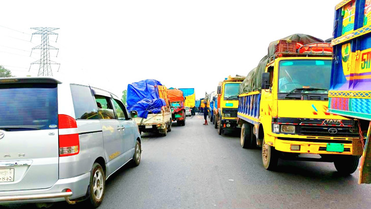 সরেজমিন বঙ্গবন্ধু সেতু পূর্ব রেলস্টেশন ঘুরে দেখা গেছে, সকাল থেকে বাস ও ট্রাক সারিবদ্ধভাবে দাঁড়িয়ে আছে। সেগুলো থেমে থেমে চলছে। আবার কোথাও যানজটের কারণে আটকে রয়েছে।