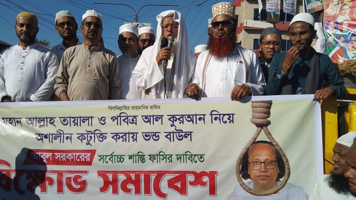 সমাবেশে বক্তারা বলেন, বাউল শিল্পী আবুল সরকার মহান আল্লাহ তায়ালা ও পবিত্র কোরআন শরিফ নিয়ে যে অশালীন ও কুরুচিপূর্ণ কটূক্তি করেছে এতে আমাদের মুসলমানদের রক্তক্ষরণ হচ্ছে।আমরা বর্তমান সরকারের কাছে বাউল আবুল সরকারের সর্বোচ্চ শাস্তি ফাঁসির দাবি করছি। না হয় আরো বৃহত্তর আন্দোলন গড়ে তোলা হবে। প্রতিবাদ সমাবেশ শেষে দোয়া মোনাজাত অনুষ্ঠিত হয়। এরপর বাউল আবুল সরকারের কুশপুত্তলিকা দাহ করেন উপস্থিত অংশগ্রহণকারীরা।