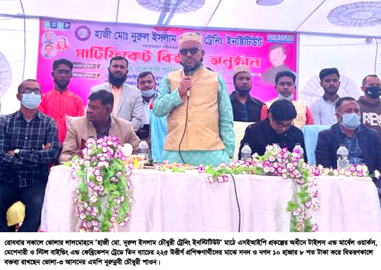 রবিবার সকালে ‘হাজী মো. নুরুল ইসলাম চৌধুরী ট্রেনিং ইনস্টিটিউট’ মাঠে এসইআইপি (ঝঊওচ) এর অধীনে বিভিন্ন ক্যাটাগরীতে উত্তীর্ণ প্রশিক্ষণার্থীদের সনদ ও নগদ অর্থ প্রদান অনুষ্ঠানে প্রধান অতিথি বক্তব্যে এসব কথা বলেন তিনি।