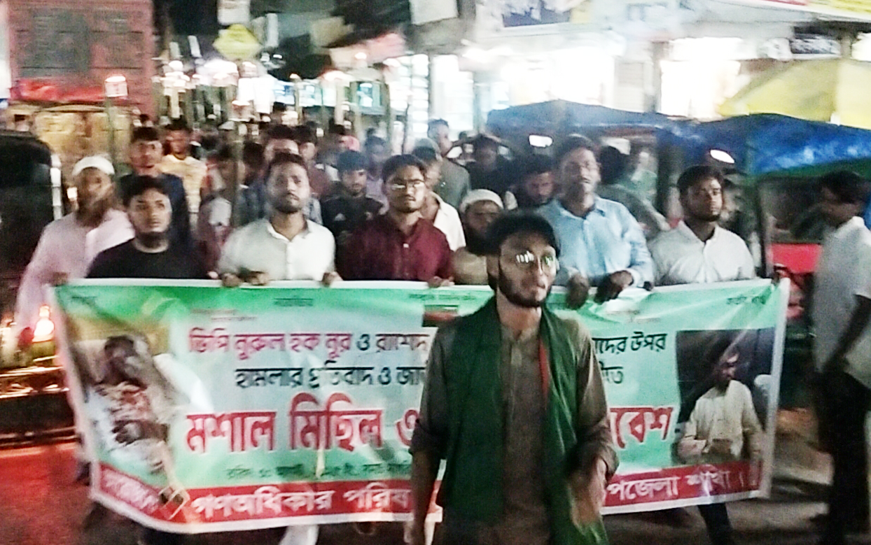 গণঅধিকার পরিষদের সভাপতি নুরুল হক নুরসহ কেন্দ্রীয় নেতাদের ওপর হামলার প্রতিবাদে ভোলার লালমোহন উপজেলায় মশাল মিছিল করা হয়েছে। শনিবার সন্ধ্যায় উপজেলা গণঅধিকার পরিষদের আয়োজনে লালমোহন সরকারি মডেল মাধ্যমিক বিদ্যালয়ের সামনে থেকে মশাল মিছিলটি বের হয়ে পৌরশহরের প্রধান প্রধান সড়ক প্রদক্ষিণ করে চৌরাস্তার মোড়ে গিয়ে শেষ হয়। পরে সেখানে বিক্ষোভ সমাবেশ অনুষ্ঠিত হয়।