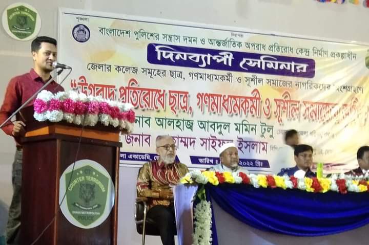 বাংলাদেশ পুলিশের সন্ত্রাস দমন ও আন্তর্জাতিক অপরাধ প্রতিরোধ কেন্দ্র নির্মাণ প্রকল্প অধীন দিন ব্যাপী সেমিনার , ভোলার গনমাধ্য কর্মী ও জেলার কলেজের ছাত্র ও সূশীল সমাজের নাগরিকদের অংশগ্রহণে,, উগ্র বাদ প্রতিরোধে ছাত্র ও গণমাধ্যমের কর্মীও সূশীল সমাজের ভূমিকা,, শীর্ষক আজ সকালে শিল্প কলা একাডেমী মিলনায়তনে অনুষ্ঠিত হয়েছে।