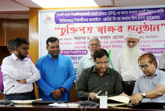 টাঙ্গাইলের মাওলানা ভাসানী বিজ্ঞান ও প্রযুক্তি বিশ্ববিদ্যালয়ের শিক্ষার্থীদের পরীক্ষার ফলাফল প্রস্তুত ও প্রকাশসহ যাবতীয় কার্যক্রম অটোমেশন এর মাধ্যমে সম্পন্নের নিমিত্তে SPG এর মাধ্যমে Credit Fee Bank/Online System এ জমা দেয়ার জন্য সোনালী ব্যাংক পিএলসির সাথে দ্বিপাক্ষিক চুক্তি স্বাক্ষরিত হয়েছে।