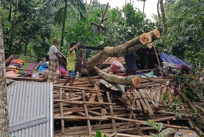 সরেজমিনে গিয়ে দেখা যায়, উপজেলার পশ্চিম চরউমেদ ইউনিয়নের ৯ নম্বর ওয়ার্ডের ইলিশাকান্দি এলাকার মুনাফ খলিফা বাড়ির জামাল খলিফার বসতঘরটি পুরোপুরি বিধ্বস্ত হয়ে দুমড়ে-মুচড়ে পড়ে রয়েছে। ওই ঘরটি নতুন করে নির্মাণ করা ছাড়া অন্য কোনো উপায় নেই।জামাল খলিফার স্ত্রী বুলবুল বেগম জানান, আমাদের বসতঘরের সামনে কাপড়ের দোকানও ছিল। আমি দোকান পরিচালনা এবং সেলাইয়ের কাজ করতাম। শুক্রবার রাতে আমি ছেলেকে নিয়ে ঘরে ছিলাম। হঠাৎ বিকট শব্দে ঘরের পেছনে থাকা একটি চাম্বুল গাছ উপড়ে আমাদের ঘরের ওপর পড়ে। চোখের পলকেই পুরো ঘরটি চূর্ণবিচূর্ণ হয়ে যায়। ভাগ্য ভালো বিধায় ছেলে আর আমি কোনো রকমে প্রাণে বেঁচে যাই।