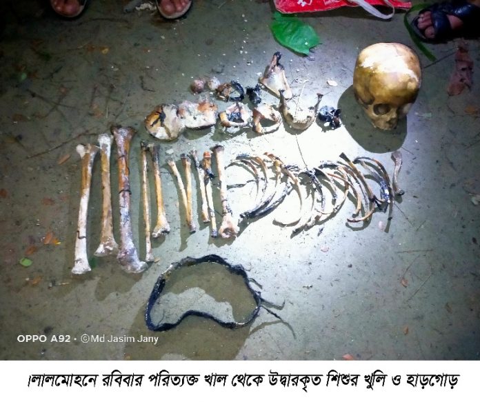 ভোলার লালমোহনে পরিত্যক্ত খালে মিলল শিশুর মাথার খুলি ও হাড়গোড়। রবিবার সন্ধ্যায় পৌরসভার ৮নং ওয়ার্ড ওয়েষ্টার্ণপাড়া শেখের দোকানের পশ্চিম পাশে কালভার্ট সংলগ্ন খালে এই খুলি ও হাড়গোড় পাওয়া যায়। পাওয়া যায় শিশুর পড়নে থাকা পেন্টের বেল্টও। কয়েকমাস আগে সেখানকার রাশেদের ছেলে ৩য় শ্রেণির ছাত্র রায়হান (১০) নামের এক শিশু নিখোঁজ হয়। উদ্বারকৃত খুলি ও হাড়গোড় ওই শিশুর বলে নিখোঁজ শিশুর পিতা রাশেদ দাবী করেন। তবে লালমোহন থানার ওসি (তদন্ত) এনায়েত হোসেন জানান, খুলি ও হাড় পরীক্ষার আগে কার তা বলা যাবে না।