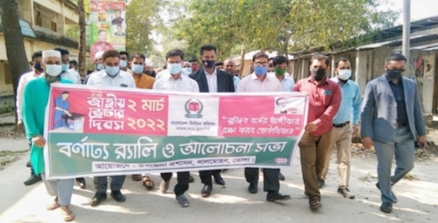 মুজিববর্ষের অঙ্গীকার, রক্ষা করব ভোটাধিকার’ প্রতিপাদ্যে ভোলার লালমোহনে চতুর্থ জাতীয় ভোটার দিবস পালিত হয়েছে। দিবসটি উপলক্ষে বুধবার (২ মার্চ) সকালে উপজেলা প্রশাসনের আয়োজনে উপজেলা পরিষদ প্রাঙ্গণ থেকে বর্ণাঢ্য র্যালি বের করা হয়। র্যালিটি উপজেলা পরিষদের চত্বর ও সংলগ্ন সড়ক প্রদক্ষিণ শেষে একই স্থানে এসে সমবেত হয়। পরে উপজেলা পরিষদ হলরুমে আলোচনা সভা অনুষ্ঠিত হয়।