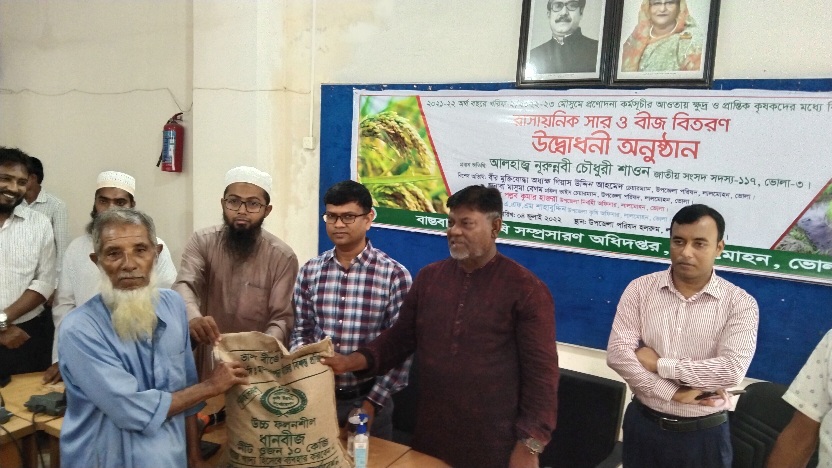ভোলার লালমোহনে ক্ষুদ্র ও প্রান্তিক কৃষকদের মধ্যে বিনামুল্যে সার, বীজও সেচযন্ত্র বিতরণ করা হয়েছে।কৃষিসম্প্রসারণ অধিদপ্তর লালমোহন উপজেলা কর্তৃক আয়োজিত সোমবার সকালে উপজেলা পরিষদ হলরুমে সার, বীজও সেচযন্ত্র বিতরণ উপলক্ষে আলোচনা সভার আয়োজন করা হয়। উপজেলা নির্বাহী কর্মকর্তা পল্লব কুমার হাজরার সভাপতিত্বে আলোচনা সভায় প্রধান অতিথি হিসেবে ভার্চুয়ালী বক্তব্য রাখেন ভোলা -৩ (লালমোহন-তজুমদ্দিন) আসনের সংসদ সদস্য নূরুন্নবী চৌধুরী শাওন। তিনি বলেন, প্রধানমন্ত্রী শেখ হাসিনার নেতৃত্বাধীন আওয়ামীলীগ সরকার কৃষকদের ভাগ্যন্নোয়নে নিরলসভাবে কাজ করছেন। বর্তমান সরকারের আমলেই দেশের কৃষিখাত এখন সমৃদ্ধ। সরকারের নানামুখী পদক্ষেপের কারণে কৃষকরা এখন কম খরচে অধিক লাভবান হচ্ছেন। এসময় অনান্যের মধ্যে উপস্থিত ছিলেন উপজেলা পরিষদের চেয়ারম্যান বীরমুক্তিযোদ্ধা গিয়াস উদ্দিন আহমেদ, উপজেলা কৃষি কর্মকর্তা এএফএম শাহাবুদ্দিন, কৃষি সম্প্রসারণ কর্মকর্তা মো. আহসান উল্যাহ, যুব উন্নয়ন কর্মকর্তা খলিলুর রহমান ইমন প্রমূখ।আলোচনা সভা শেষে ২০২১/২২ অর্থ বছরে খরিপ-২ ও ২০২২/২৩ মৌসুমে প্রণোদনা কর্মসূচির আওতায় ৯২০ জন কৃষকের মধ্যে সার-বীজ ও ১০ জন কৃষকের মাঝে সেচযন্ত্র বিতরণ করা হয়।