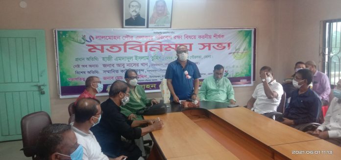 ভোলার লালমোহন পৌর এলাকার পরিবেশ রক্ষা বিষয়ে করনীয় শীর্ষক মত বিনিময় সভা অনুষ্ঠিত হয়েছে। ১ জুন ২০২১ ইং মঙ্গলবার সকাল ১১ টায় লালমোহন পৌরসভার হলরুমে পৌরসভার সহকারী প্রকৌশলী নিজাম উদ্দিন এর সঞ্চলনায় পৌরসভার ভারপ্রাপ্ত সচিব মোঃ নেছার উদ্দিনের সভাপতিত্বে প্রধান অতিথি হিসাবে উপস্থিত ছিলেন পৌর মেয়র হাজী এমদাদুল ইসলাম তুহিন, গেষ্ট অব অনার হিসাবে উপস্থিত ছিলেন পরিবেশ বাচাঁও আন্দোলনের চেয়ারম্যান আবু নাসের খান ও আমিনুল রসুল প্রমূখ। উম্মুক্ত আলোচনায় পৌরসভার বিভিন্ন সমস্যা নিয়ে বক্তব্য রাখেন, লালমোহন উপজেলা আওয়ামীলীগের যুগ্ম-সাধারন সম্পাদক আনোয়ারুল ইসলাম রিপন পাঞ্চায়েত, ৬নং ওয়ার্ড কাউন্সিলর জহিরুল ইসলাম মাসুদ পাটওয়ারী, সাংবাদিক শাহীন আলম মাকসুদ, ইব্রাহীম হাওলাদার, আবদুর রাজ্জাক হাওলাদার, জয়ন্ত চন্দ পন্টি, রোকেয়া বেগম, আল-আমিন, নিয়াজ মুশফিক, মাওলানা আবদুল আউয়াল প্রমূখ।
