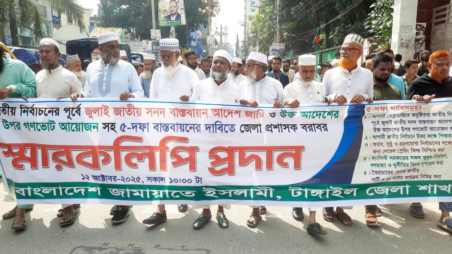 জাতীয় সংসদ নির্বাচনের পূর্বে জুলাই জাতীয় সনদ বাস্তবায়ন আদেশ জারি, গণভোট আয়োজন এবং পাঁচ দফা দাবি বাস্তবায়নের দাবিতে টাঙ্গাইল জেলা জামায়াতে ইসলামী জেলা প্রশাসকের কাছে স্মারকলিপি প্রদান করেছে।